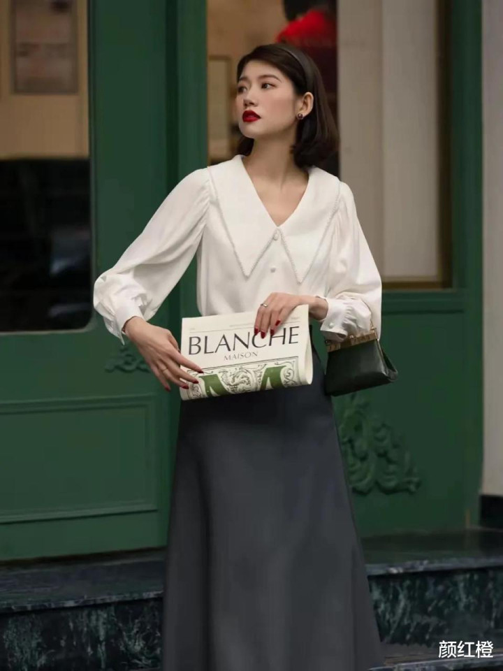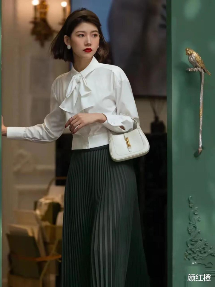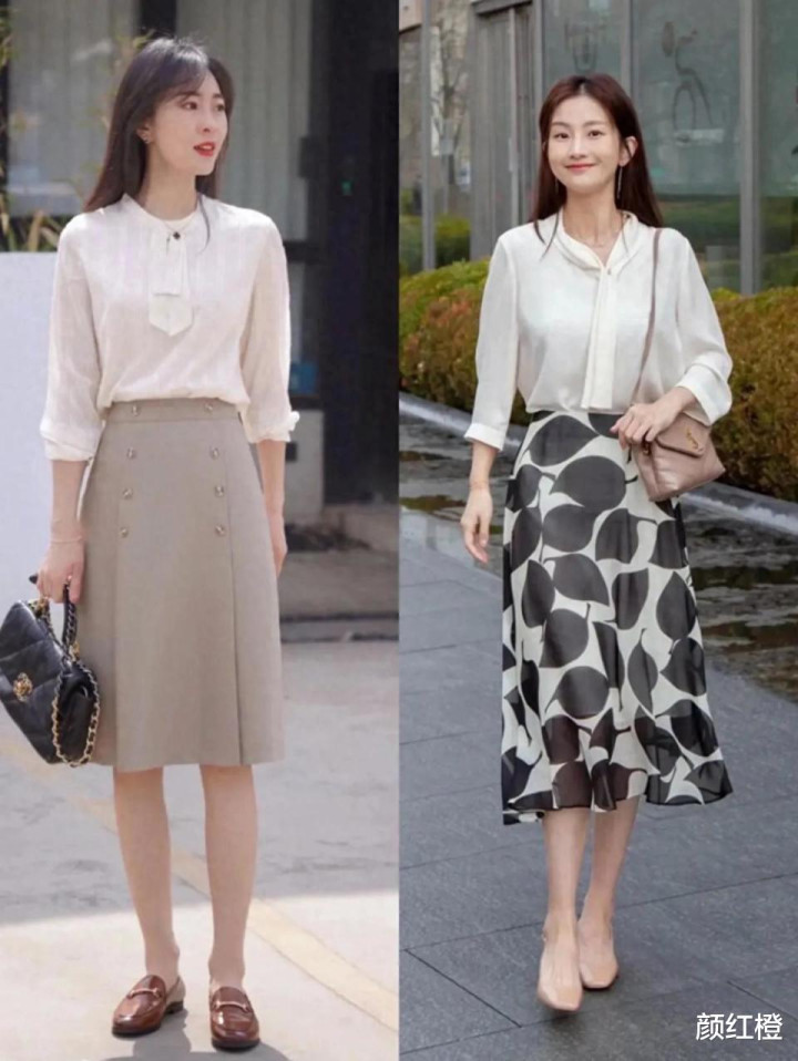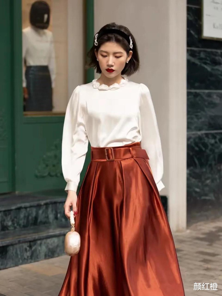 你选择的是半身裙还是连衣裙都要选择高腰收腰款,这样穿的时候才能更好的提升腰线,使得你的身材形成三七分显高显瘦,例如下面这一件真丝面料的白色衬衫,搭配上丝绸面料的半身裙,穿出来的效果显贵又大方。