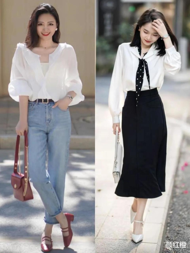 有的时候我们不想要那种优雅的气质风格,那么我们可以选择比较清爽干练的通勤风,例如下面这位达人直接选择灯笼袖的白色衬衫,内搭白色T恤或者是小吊带,再加上一款天生就拥有时尚元素的牛仔裤,脚踩一双红色的玛丽珍鞋,手上提的也同样色调的皮质小包包,这样的穿衣打扮经典耐看。