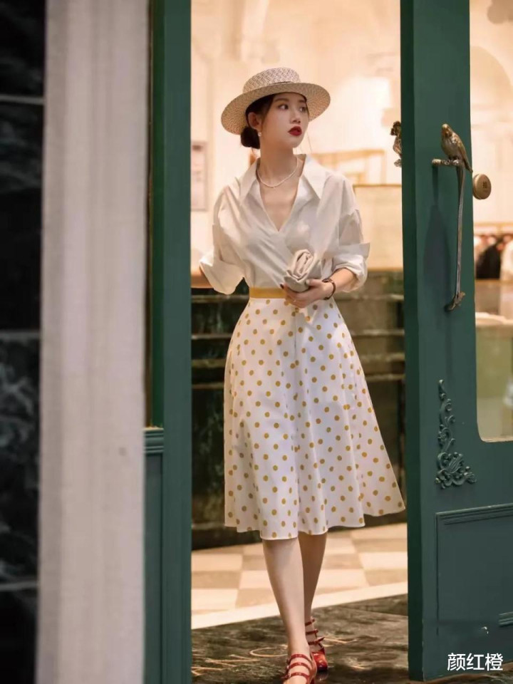 下面这一套穿衣打扮的衬衫上衣会偏向经典款一点,不过这件的衣服面料一看就比较厚实,有质感,也不容易起毛起球,穿在身上之后,瞬间就很上档次,为了让整个造型不会过于死板,博主直接选择了波点的伞状半身裙来搭配,脚上穿的是一双红色的玛丽珍鞋,在搭配上,珍珠项链,耳环和草帽,瞬间让整体的造型气质和品位提升到另一个高度。