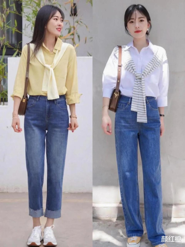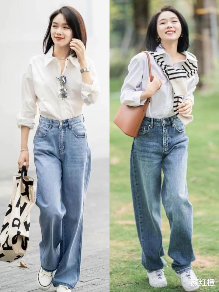 正常情况下来说选择帆布鞋的时候,其实更推荐大家避开粉色系或者是红色啊,比较艳丽的色调,黑色帆布鞋,白色帆布鞋是最百搭的,例如下面用白色的衬衫搭配上牛仔直筒阔腿裤,脚踩双白色的帆布鞋,穿出来的效果清清爽爽,显得很精致。
