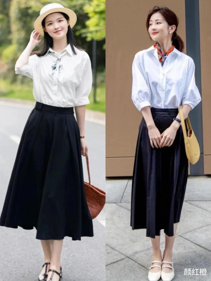 如果担心出错的情况下,用黑白两个色调进行组合搭配最佳,比如下面用一件白色的衬衫搭配上黑色的伞状半身裙,脚踩一双浅口的单鞋,头上戴的一款草帽,氛围感直接拉满,经典耐看。