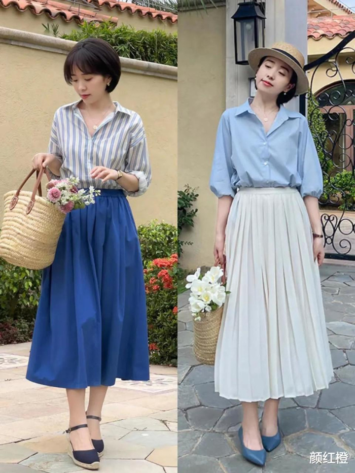 如果年龄是在40岁左右的情况下,我们更推荐大家选择百褶半身裙或者是压褶半身裙,色彩的话,可以像下面这两位达人一样,用浅蓝色的衬衫或者是条纹衬衫来搭配,穿出来的效果就显年轻又洋气。