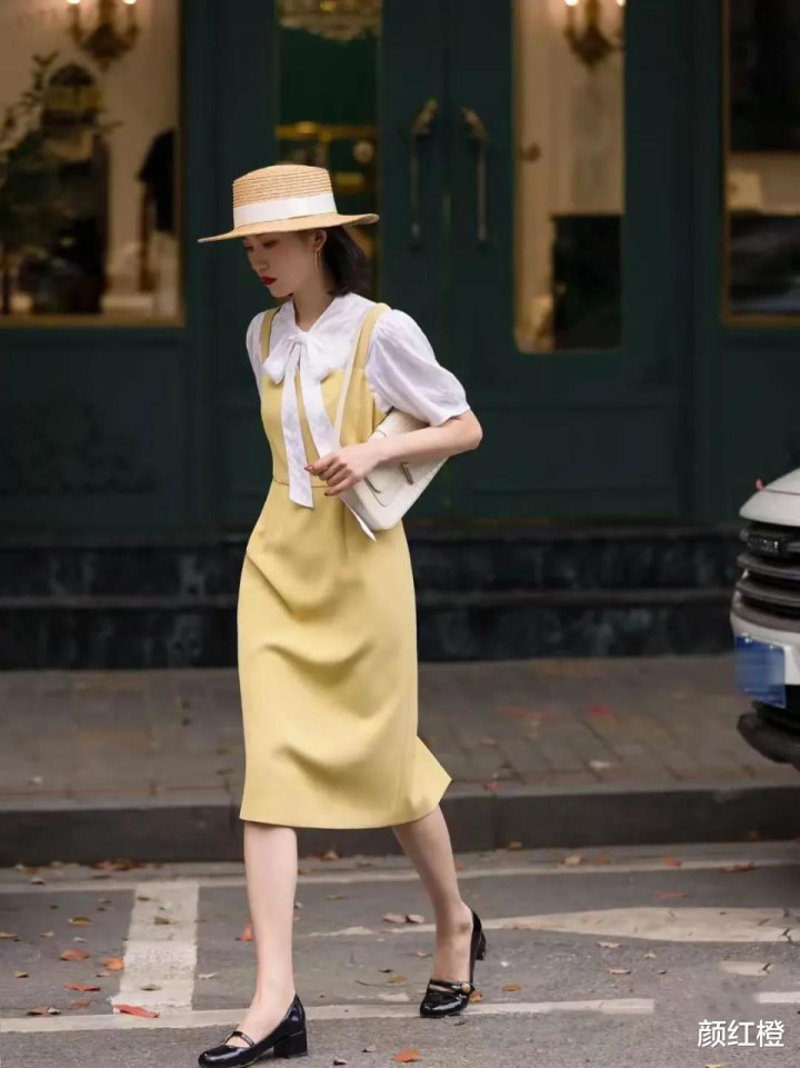 想让自己打扮造型更加个性,我们用撞色的搭配效果,比如下面这一套穿衣打扮,用一件黄色系的吊带连衣裙,内搭白色的雪纺衬衫,而且这一件衬衫属于泡泡袖的款式,穿在身上之后有一种甜美风,又和连衣裙搭配,瞬间变得更加优雅大气。