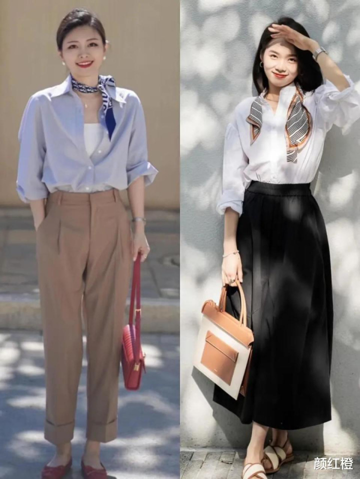 在这炎热的春夏季节,少不了的就是一件清爽干练的衬衫上衣,它可以搭配裙子,也可以搭配长裤,不过想要把衬衫穿出不一样的时尚感,还是要在衣服的面料款式版型上下足功夫才行,甚至是最难解决的色彩搭配,也要细心选择。不过我们可以借鉴素人博主的穿搭示范,例如下面这两位达人的穿衣造型,用雪纺衬衫上衣搭配上直筒半身裙或者是印花的伞状半身裙,脚踩一双皮质的浅口单鞋,乐福鞋,呈现出来效果优雅得体。