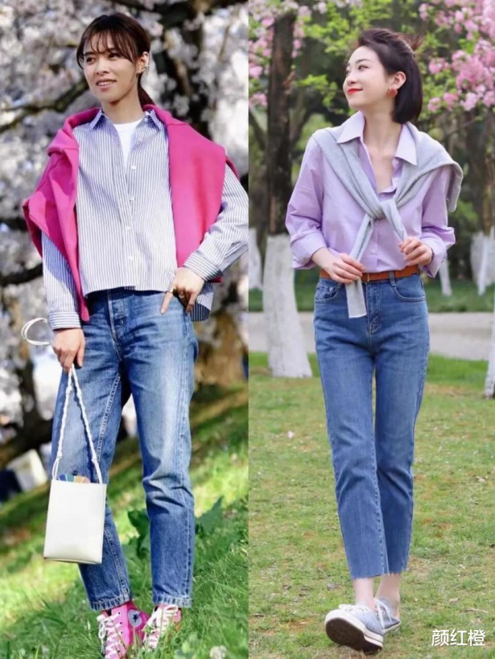 如果你要选择休闲风的情况下,我们可以像下面这两位达人一样,直接选择帆布鞋来搭配,不过下面这两套穿搭最好看的还是右边的这一套,主要的原因是紫色的上衣一看就很有质感,包括九分牛仔裤穿在身上不会起褶皱,看起来会更加的干净利落。