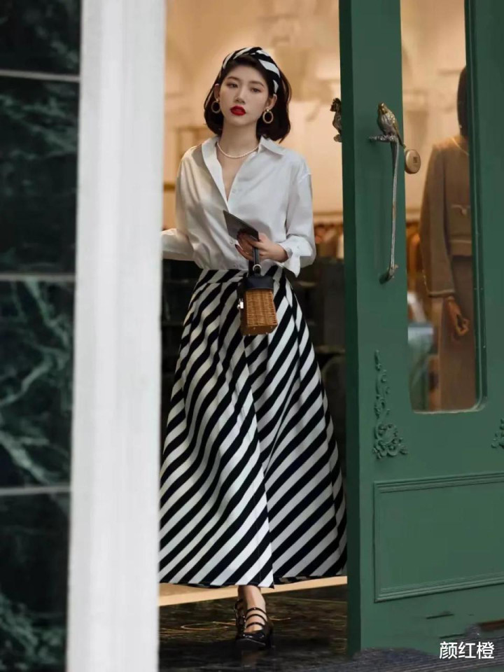 我们也可以选择最为经典的黑白两个色调搭配,例如直接用白色衬衫搭配上黑白条纹设计的伞状半身裙,脚踩双黑色的皮质单鞋,达人为了让造型更精致,还在头上扎了一款黑白设计的丝巾,还有金色的耳环,白色的珍珠项链,这样的穿衣打扮清清爽爽是春夏季节最为合适的穿衣配色,普通大众女性穿了也不会出错。